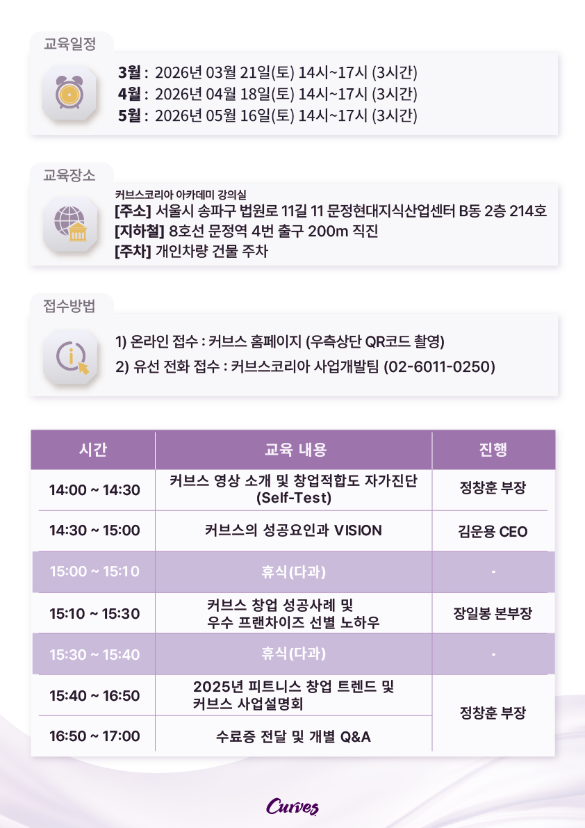 창립 20주년을 맞이하여 2026년 3~5월 안양|평택|이천 지역을 찾아가는 '커브스 창업 토크쇼'를 진행합니다. ![]() ▶커브스 창업 토크쇼 보러가기(클릭) 최대 1500만원+a 역대급 특전! 2026 커브스 창업 아카데미 창립 20주년 커브스가 100세 시대 헬스케어 프랜차이즈의 성공비결을 가감없이 공개합니다! ![]() ![]() ▼커브스 창업 아카데미 신청하기▼ ![]() ![]() ![]() ![]() 커브스 아카데미 수료자 특전 안내 ① 초기 창업자금 지원 (최대 1500만원) ② 온/오프라인 마케팅 지원 ③ 교육지원 (본사 멘토 오픈지원 1개월) ④ 목표달성 시 인센티브 지원 [교육일정] 3월 21일(토) 14~17시 (10명) 4월 18일(토) 14~17시 (10명) 5월 16일(토) 14~17시 (10명) [교육장소] 커브스코리아 아카데미 강의실 서울시 송파구 법원로 11길 11 문정현대지식산업센터 B동 21호 (8호선 문정역 4번 출구 200m 직진) (자차 이동 시 건물 주차가능) [접수방법] 온라인 접수 커브스 홈페이지 (클릭) 또는 전화 접수 ☎ 02-6011-0250 (커브스코리아 사업개발팀) |