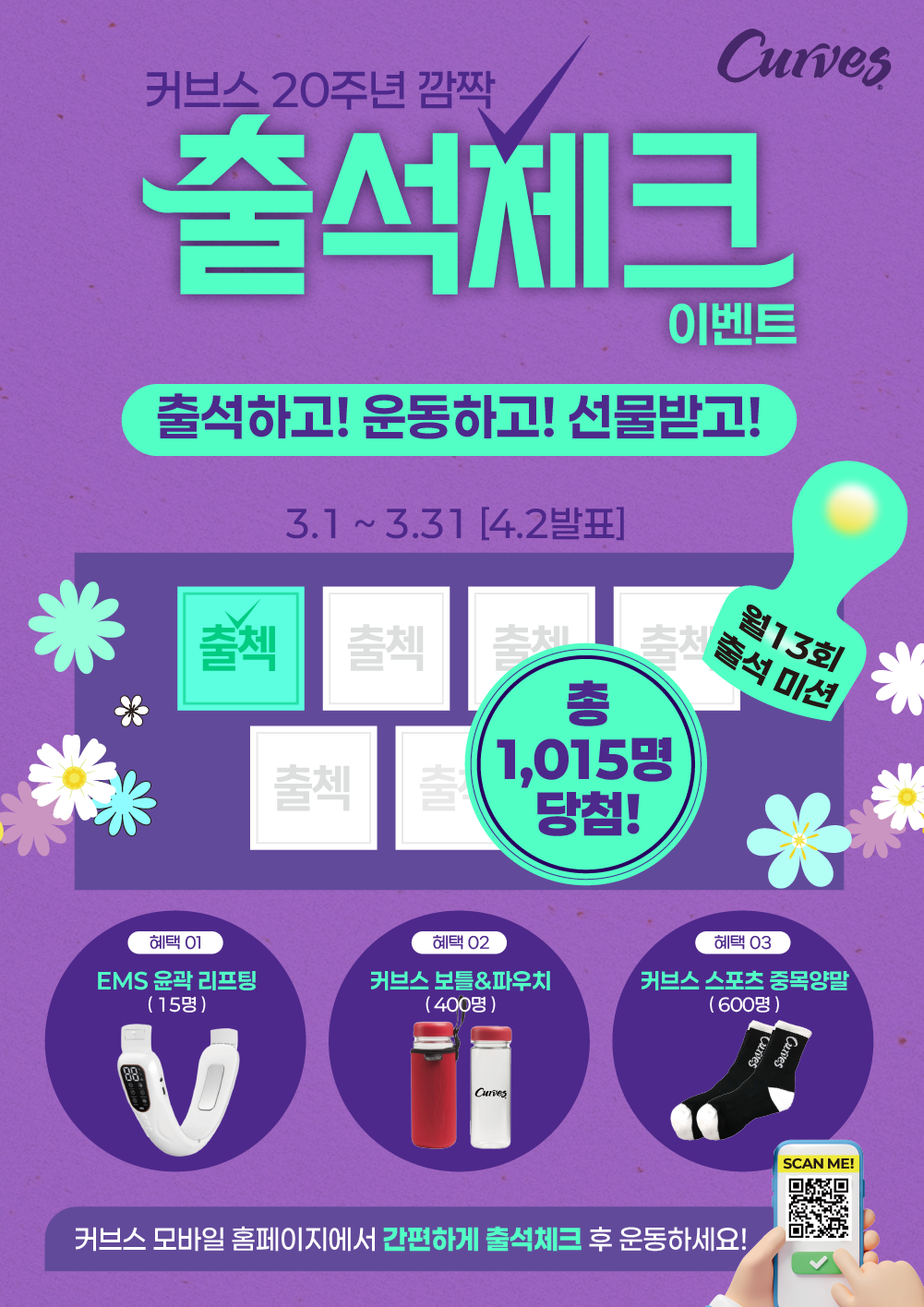 3월에도 계속되는 커브스 20주년 깜짝 ★출석체크★ 이벤트 출석하고! 운동하고! 선물받고! 커브스 20주년 맞이 깜짝 출석 이벤트 3월에도 계속됩니다. 열출석해서 운동과 선물 일석이조의 행운을 가져가세요~!