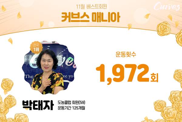 우선 커브스를 소개해준 직장동료에게 고마움을 전하고 마감직전에 가도 불편함 없이 받아준 커브스 쌤들에게 감사합니다. 커브스도농클럽에서 폼롤러라는 추가운동을 배우고 출석 이벤트로 재미있게 이끌어주신 점, 내몸의 변화를 정확히 알 수 있게 인바디 측정을 필수적으로 권해주셔서 도움이 많이 됐습니다. 커브스도농클럽 쌤들! 편하게 이끌어주셔서 고맙습니다.