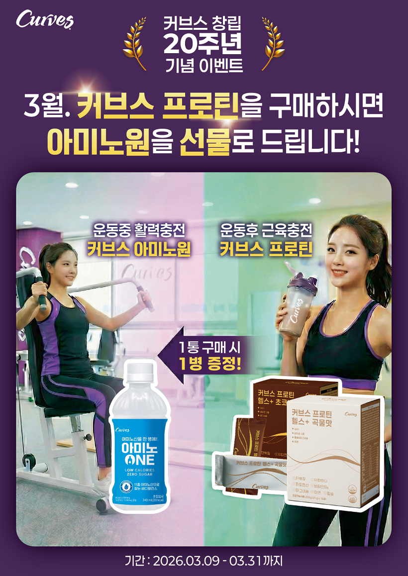 따뜻한 26년 새봄을 맞이하여 커브스에서 준비한 특별한 상품 이벤트 다니시는 클럽에서 커브스 프로틴 (곡물맛/초코바나나/베리맛)을 구매하시면 커브스 아미노원 1병을 선물로 드립니다. (일부 클럽 행사 제외) 운동 중 = 커브스 아미노원으로 활력 충전! 운동 후 = 커브스 프로틴으로 근육 충전! [행사기간] 2026.3.9~2026.3.31일까지 (문의 : 커브스 클럽 데스크) ![]() 커브스 30분 순환운동 최고의 파트너 커브스 프로틴으로 건강하고 아름다운 근육을 만들어 보세요~! |