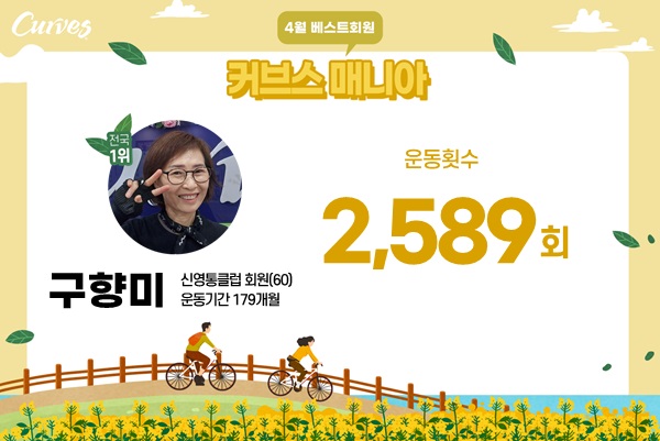 커브스를 시작하기전 제 몸은 늘 천근만근 무거웠고 수시로 찾아오는 두통과 근육통, 차가운 손발 때문에 일상이 쉽지 않았습니다. 하지만 하루 30분 운동을 이어가자 놀라운 변화가 찾아왔죠. 세심한 지도 아래 자세가 교정되면서 통증이 서서히 사라졌고, 걱정했던 갱년기 증상도 없이 건강하고 활기찬 하루하루를 보내게 되었습니다. 이제 커브스는 단순한 운동 공간을 넘어, 제 삶을 긍정적으로 바꿔준 진정한 “생활의 활력소”가 되었어요.